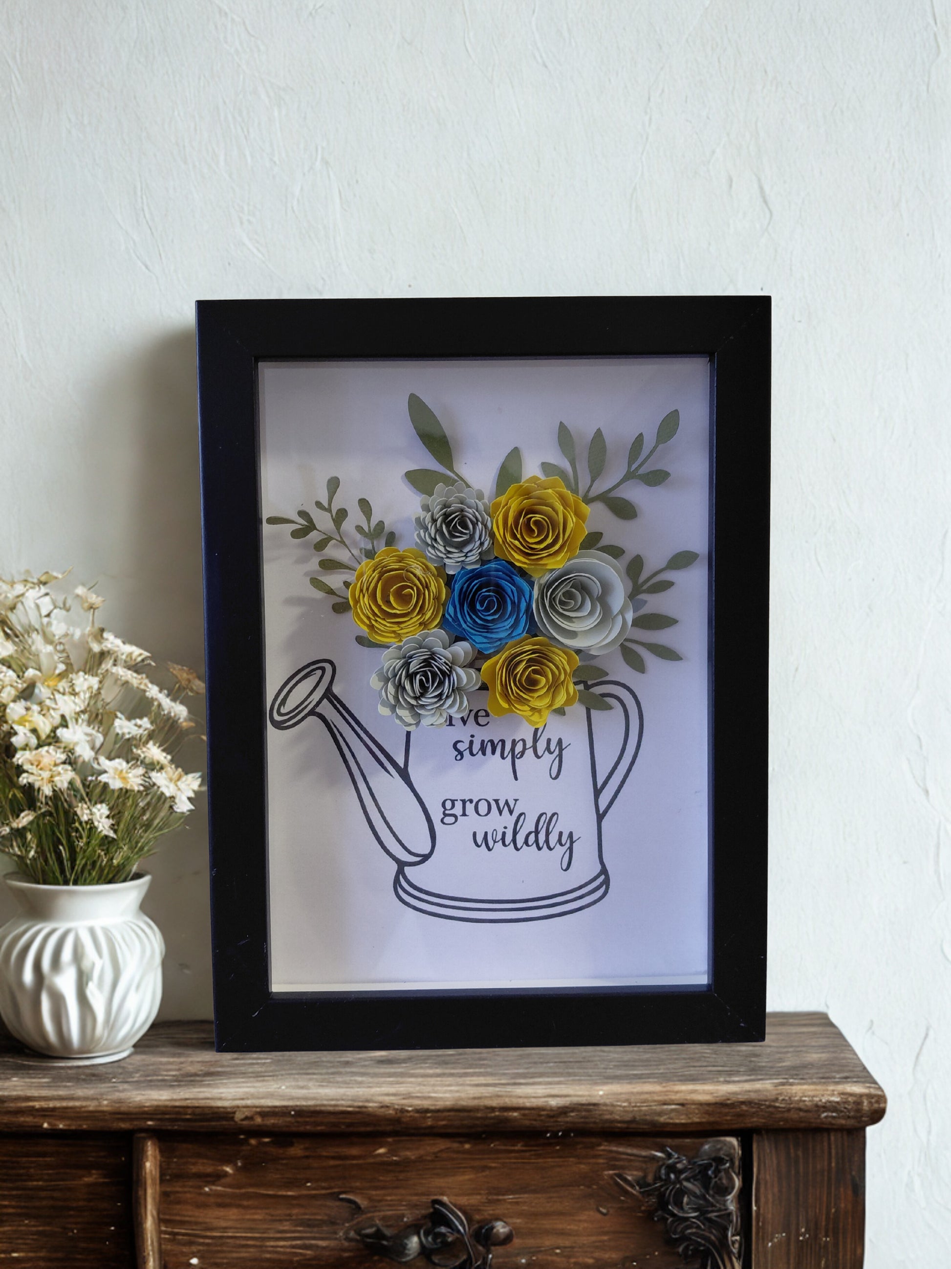 Ce cadre en fleurs papier est entièrement fait à la main, disponible en format 13x18 cm. Chaque pièce est unique et peut être adaptée selon vos préférences :